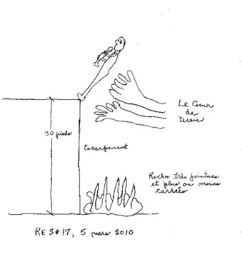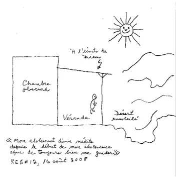 Au fil de toutes les fins de semaine d’intensif Retrouver sa Chèvre en Soi (RCS), Chevreau Adulte avait découvert qu’il était habité par un Petit Chevreau intérieur blessé encore plus merveilleux qu’il ne l’avait imaginé. Puis arriva la révélation ultime : Petit Chevreau intérieur blessé était lui-même habité d’un Petit Chevreau Divin qui était déjà en lui avant même sa naissance biologique, il y a de cela soixante-deux ans. Cet être divin était spirituellement pur, intact de toute blessure psychologique, et sa condition spirituelle n’était altérable d’aucune façon. En se référant au dessin de la petite croix de cette histoire — voir ici-bas —, Petit Chevreau Divin était représenté par la tête de l’enfant agenouillé à la membrure de la croix. Toutefois, au cours d’une psychothérapie en privée qui s’échelonna sur huit années, Chevreau Adulte avait découvert qu’il y avait un adolescent, possiblement Chevreau lui-même, mais à son stade d’adolescence, qui avait jusqu’à ce jour refusé de sortir d’une certaine chambre obscure et sans fenêtre, comme un genre de bunker. Par ailleurs, après avoir vécu une douzaine de fins de semaine d’intensifs RCS — il faut relire le conte de fée RES #12 pour bien comprendre —, Chevreau Adulte continuait de garder à l’esprit cette image d’un adolescent refusant de sortir d’un bunker — voir le dessin de la chambre obscure et de la véranda ci-joint. Plus tard, Chevreau Adulte découvrit que cet adolescent était finalement sorti de cette chambre et se tenait continuellement sur une galerie recouverte d’un toit, située en bordure d’un désert constamment ensoleillé. Nuit et jour, cet adolescent scrutait, en silence, la proximité et l’horizon lointain de ce grand désert. Mais, jamais aucune parole ne sortait de sa bouche. En fait, c’était cet adolescent qui orientait toute la vie de Chevreau Adulte via sa petite voix intérieure. En revenant au dessin de la petite croix de la présente histoire, cet adolescent est représenté par la partie inférieure du corps du petit enfant qui est agenouillé à la membrure de la croix.