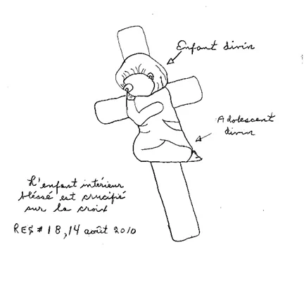 Il s’en suivit qu’à tous les matins, après quelques minutes de prière, Chevreau Adulte déposait un baiser sur la tête du petit enfant agenouillé sur la croix — c’est-à-dire Enfant Divin —, suivi d’un autre baiser sur le bas du corps de l’enfant — c’est-à-dire Adolescent Divin —, puis sur le haut de la membrure de la croix elle-même; c’est cette dernière qui représentait la personne entière qu’est Chevreau Adulte. Il se remémorait alors une parole de la Bible : « J’embrasse celui qui qui a été cloué sur la croix il y a deux-milles ans ». Puis un jour, une petite voix intérieure, toute menue, laissa entendre à Chevreau Adulte: « Celui qui est cloué sur la croix, c’est ton Petit Chevreau intérieur blessé ».